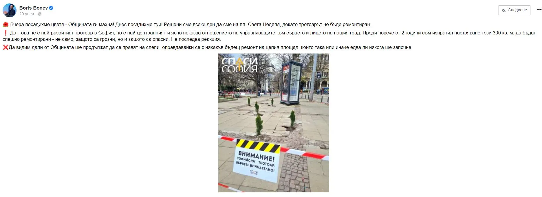 Докато саботира изграждането на тротоари, Бонев обаче се хвали, че сади цветя. В поста си той подчертава, че посадил растения на разбитите тротоари, които самият той е отказал да бъдат финансирани, за да се ремонтират.