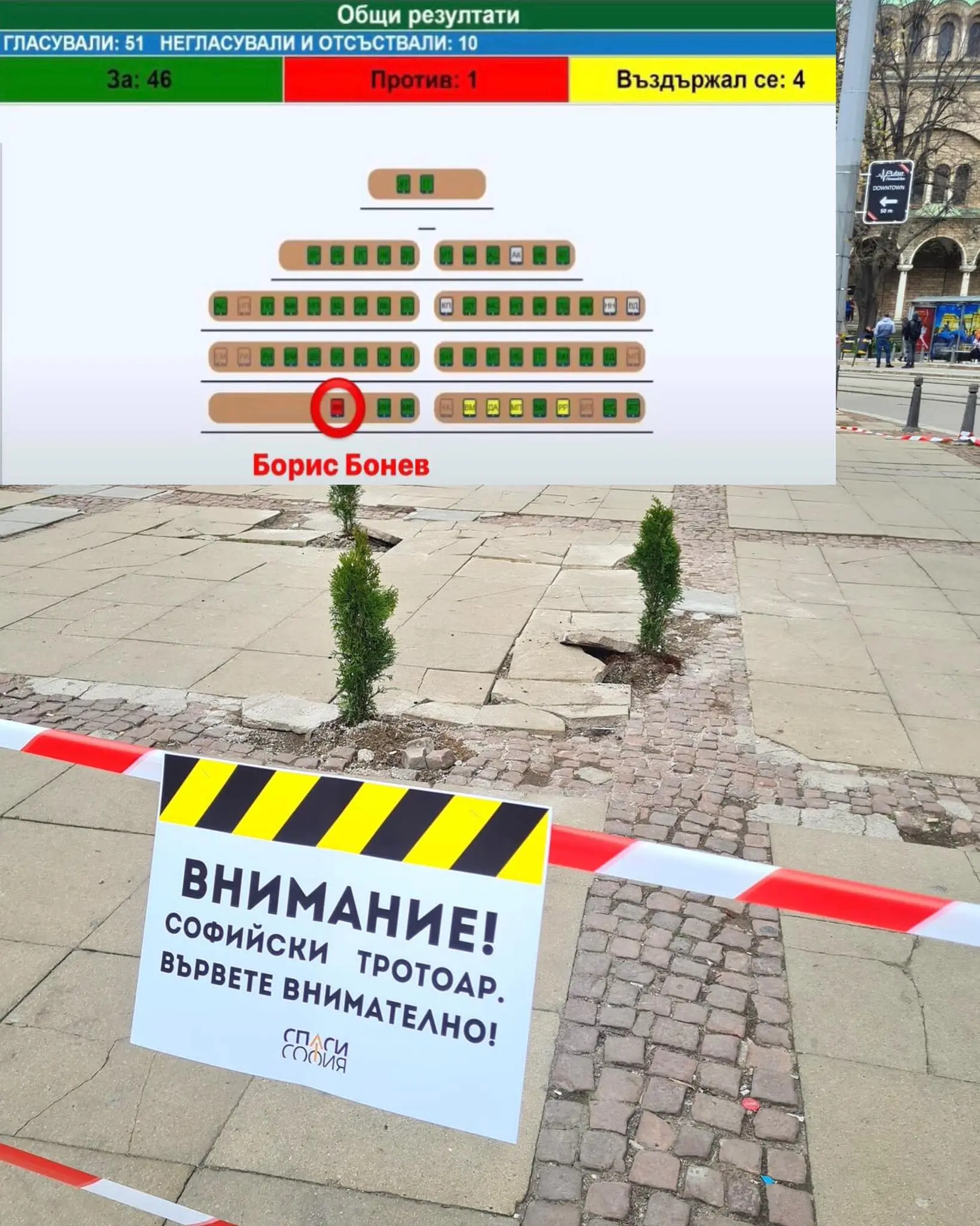Столичният общинар от „Спаси София“ Борис Бонев е единственият гласувал против изграждане на нови тротоари в столицата. Това показва справка от гласуването проведено на 09.06.22. Именно тогава Столичният общински съвет гласува заема от Европейската инвестиционна банка за реновация и изграждане на тротоари.