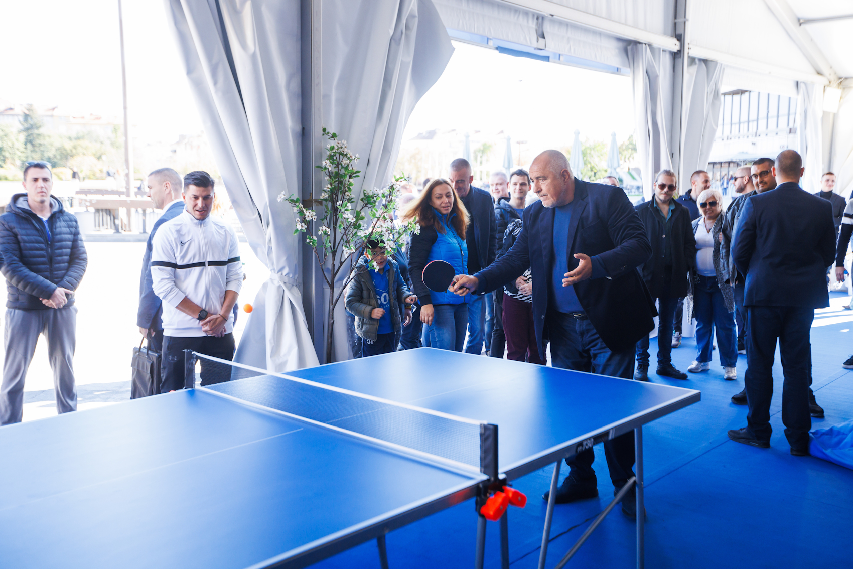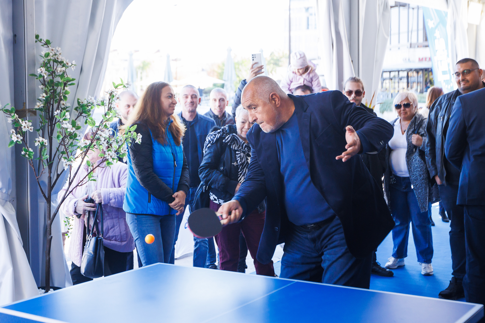 Лидерът на ГЕРБ Бойко Борисов се появи изненадващо на събитие на партията в центъра на София. Борисов игра тенис на маса, поздрави събралите се в шатрата.