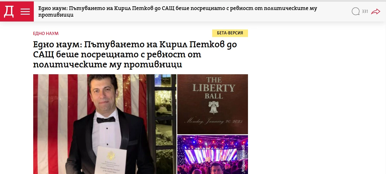 „Едно наум: Пътуването на Кирил Петков до САЩ беше посрещнато с ревност от политическите му противници“. Това заглавие в сайта на дневник видимо весели лидера на ГЕРБ Бойко Борисов.