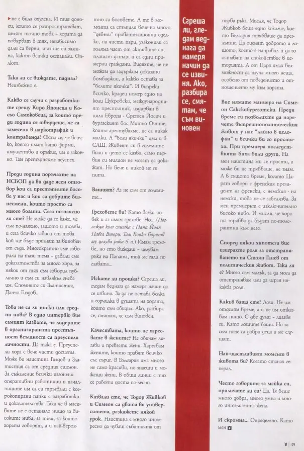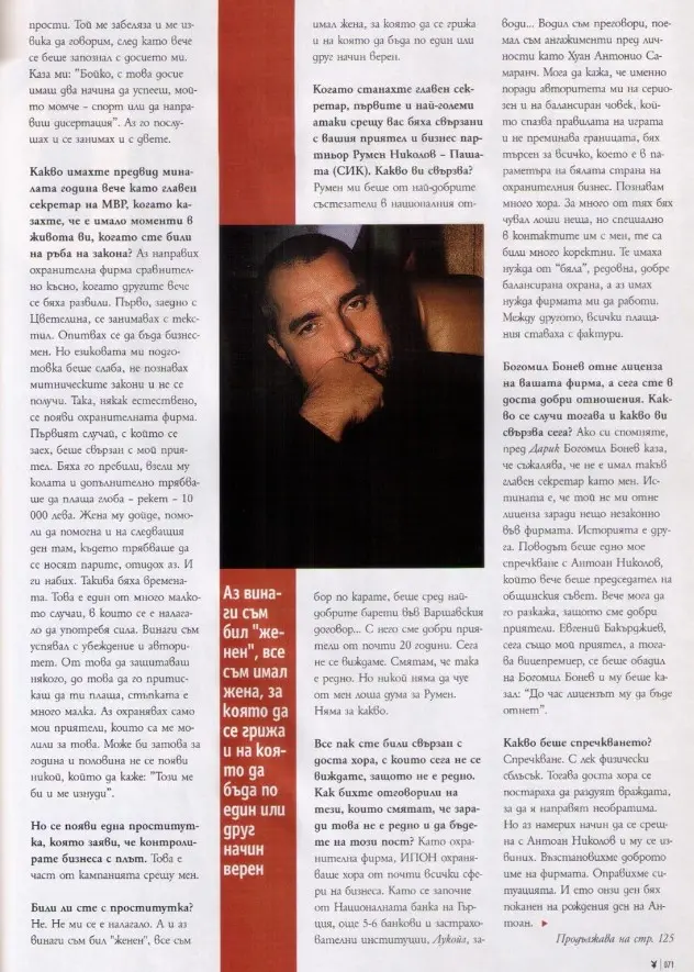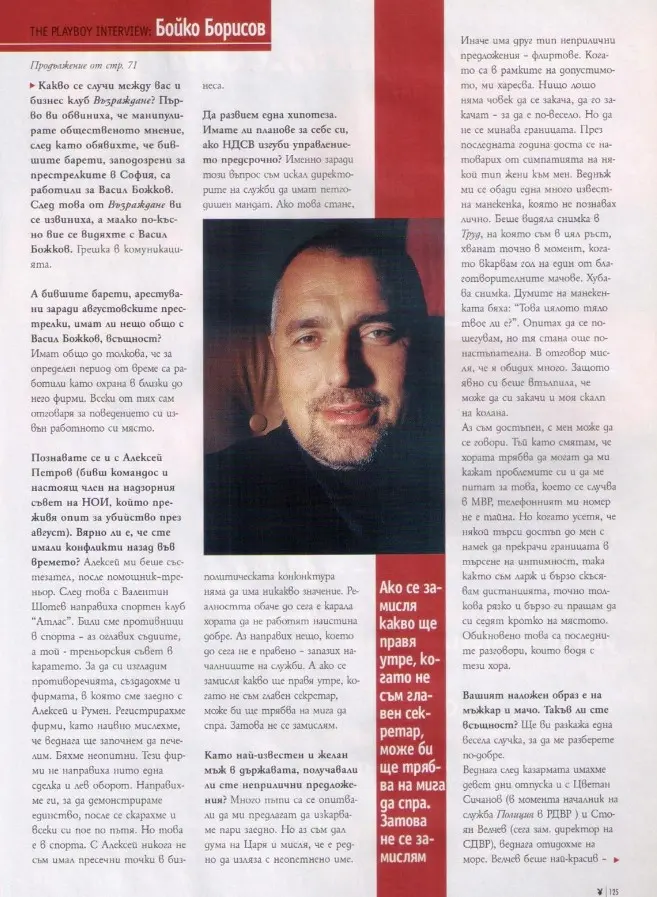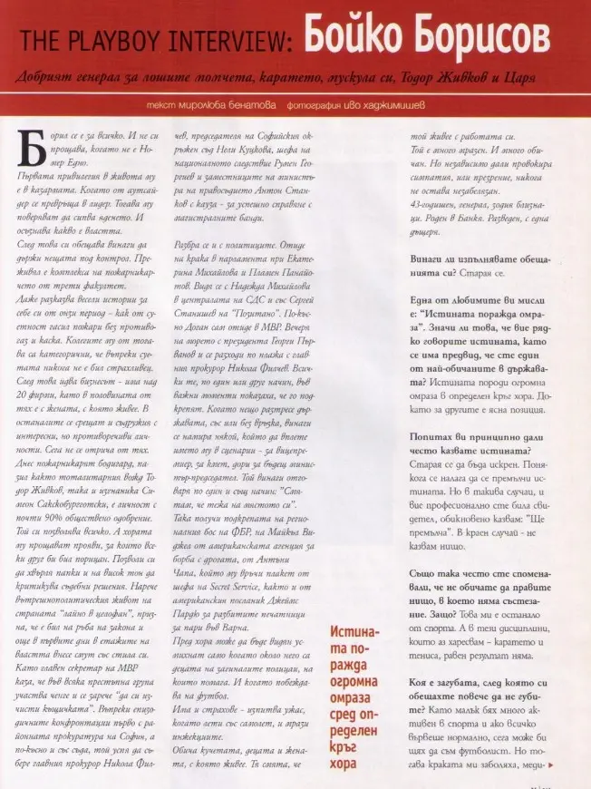 Това са думи на лидерът на ГЕРБ Бойко Борисов пред списание „Плейбой“ и журналистката Миролюба Бенатова. Тогава той още не е стартирал политическата си кариера и е Главен секретар на МВР.