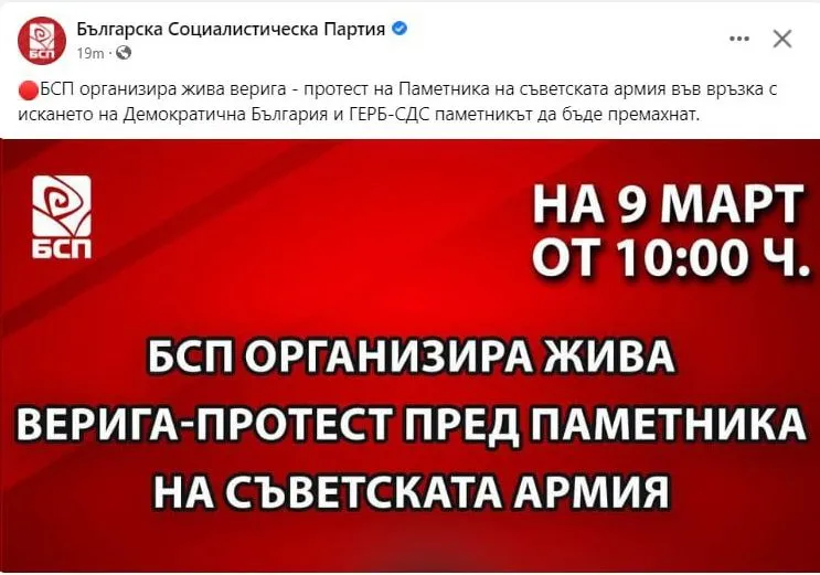 БСП обяви, че ще брани с телата си Паметника на Съветската армия. За да опазят социалистическия монумент от левицата обявиха, че утре от 10 часа ще направят жива верига около паметника.