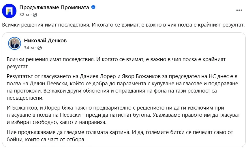 „Всички решения имат последствия. И когато се взимат, е важно в чия полза е крайният резултат“. Това написа във Фейсбук Николай денков по повод поисканите оставки на Даниел Лорер и Явор Божанков, както и изключавето на Лорер от партията.