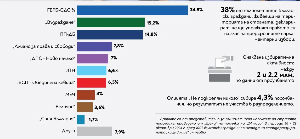 ГЕРБ-СДС получава подкрепата на 24,9% от гласуващите. За второто място се води битка между „Продължаваме промяната“ – „Демократична България“ и „Възраждане”. Това сочат резултатите от проучването на изследователския център „Тренд“ по поръчка на „24 часа“.
