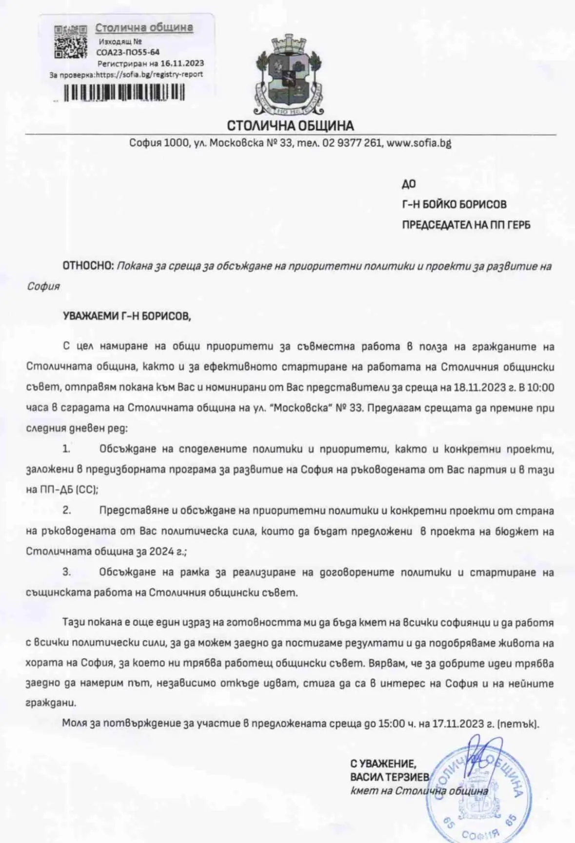 Тази вечер в централата на ГЕРБ е получена покана от кмета на София Васил Терзиев до лидера на партията Бойко Борисов. Новината беше съобщена от пиарът Никола Николов, който показа поканата на официална бланка на общината.