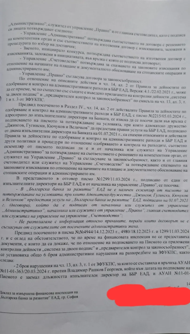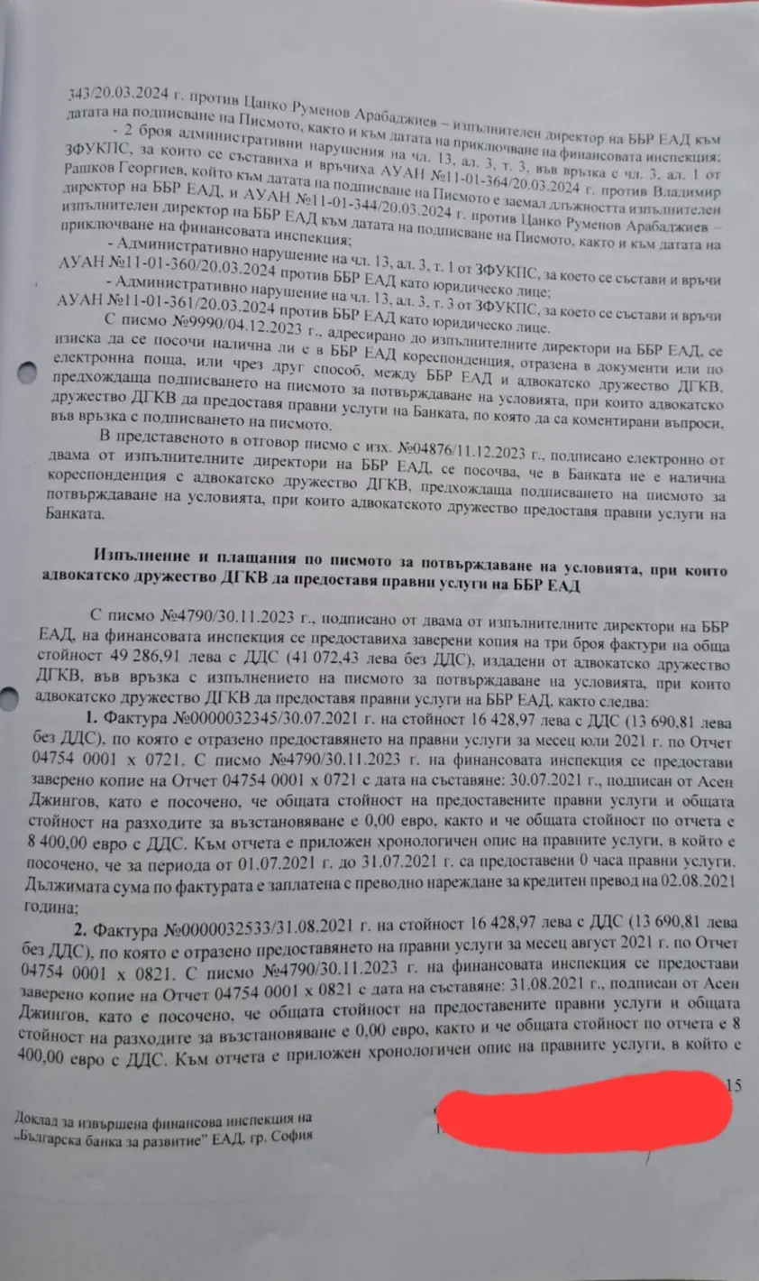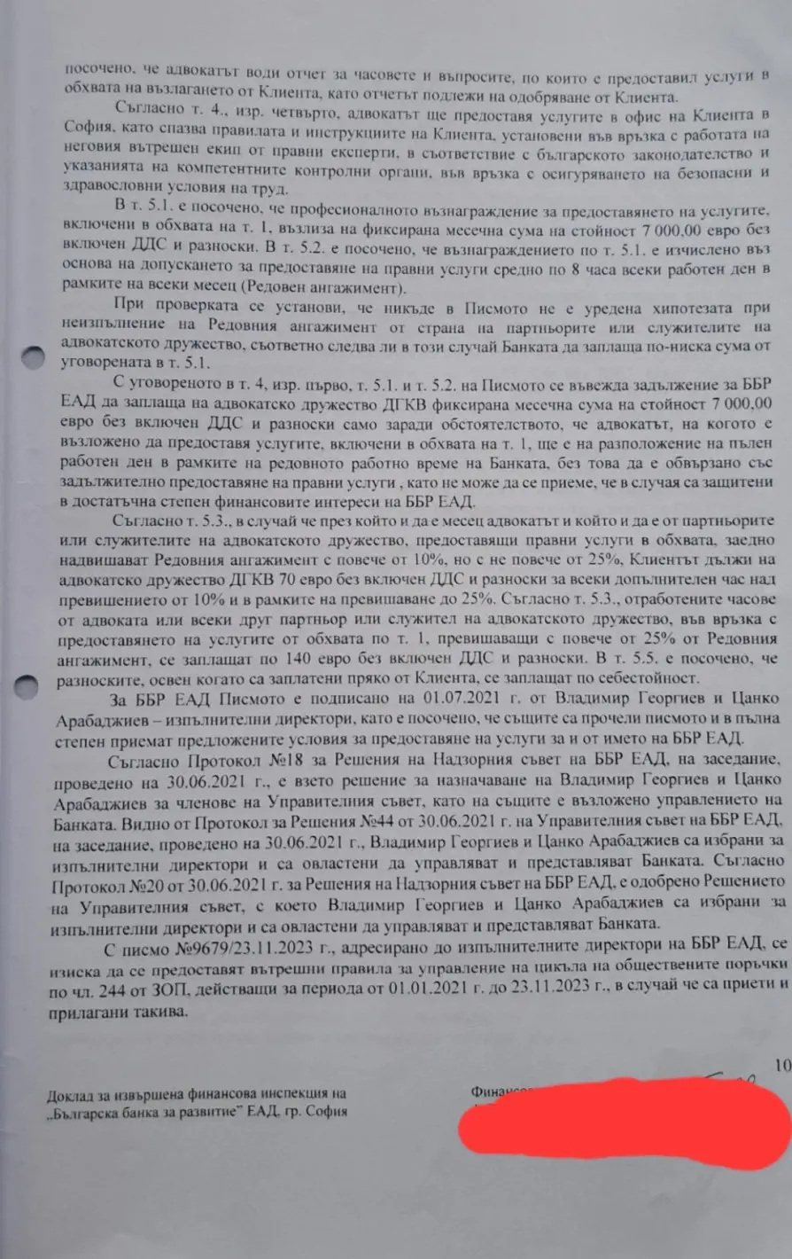 От доклада: „Предвид гореизложеното, се установява, че не е изпълнено задължението по т.4., изр. Второ от Писмото и адвокатът, на когото е възложено да предоставя правните услуги по Писмото, лично не е водил отчети, в които да опише часовете и въпросите, по които са предоставяни услуги в обхвата на възлагането. Представени са отчети за месеците юли и август 2021 г., подписани от един от съдружниците в адвокатското дружество ДГКВ, придружени с хронологични описи на услугите за съответния период, по които са отчетени общо 0 часа предоставени услуги, като отчетите не са одобрени от ББР ЕАД, каквото е изискването по т.4, изр. трето от Писмото“.