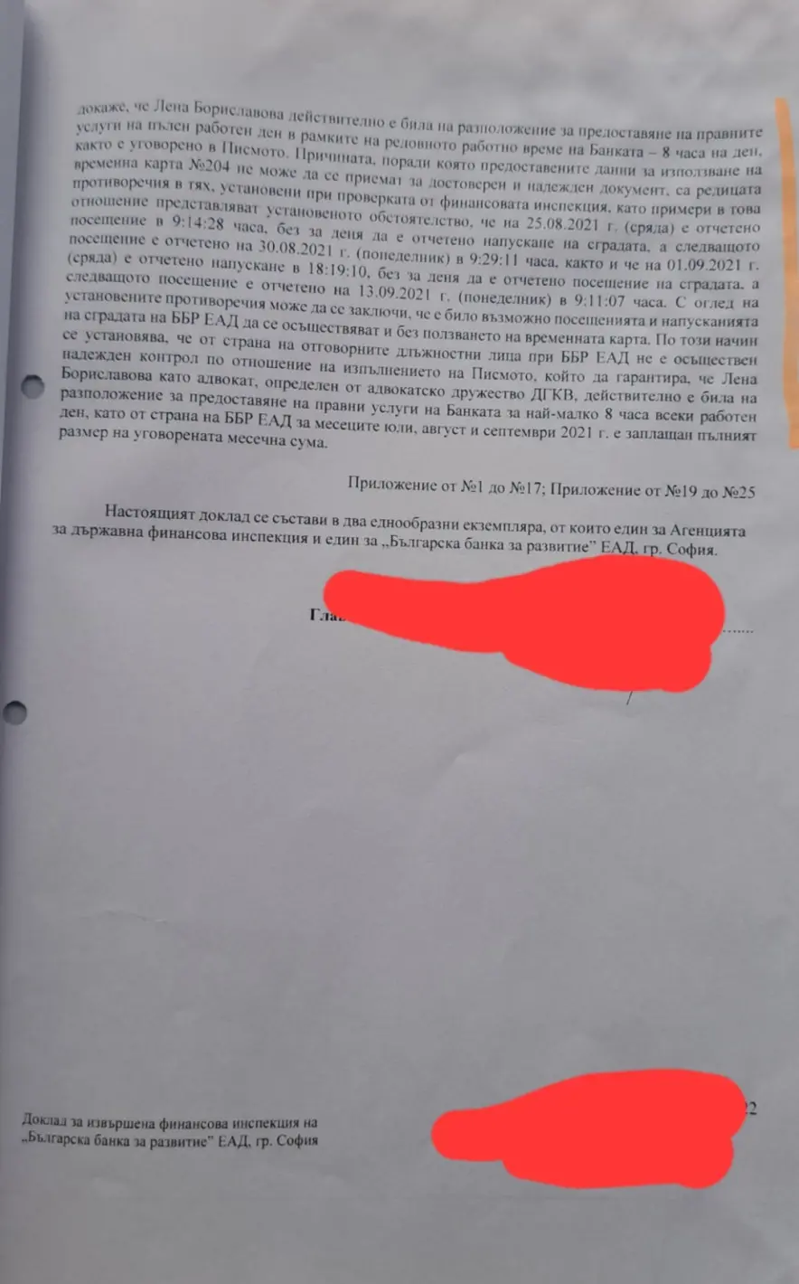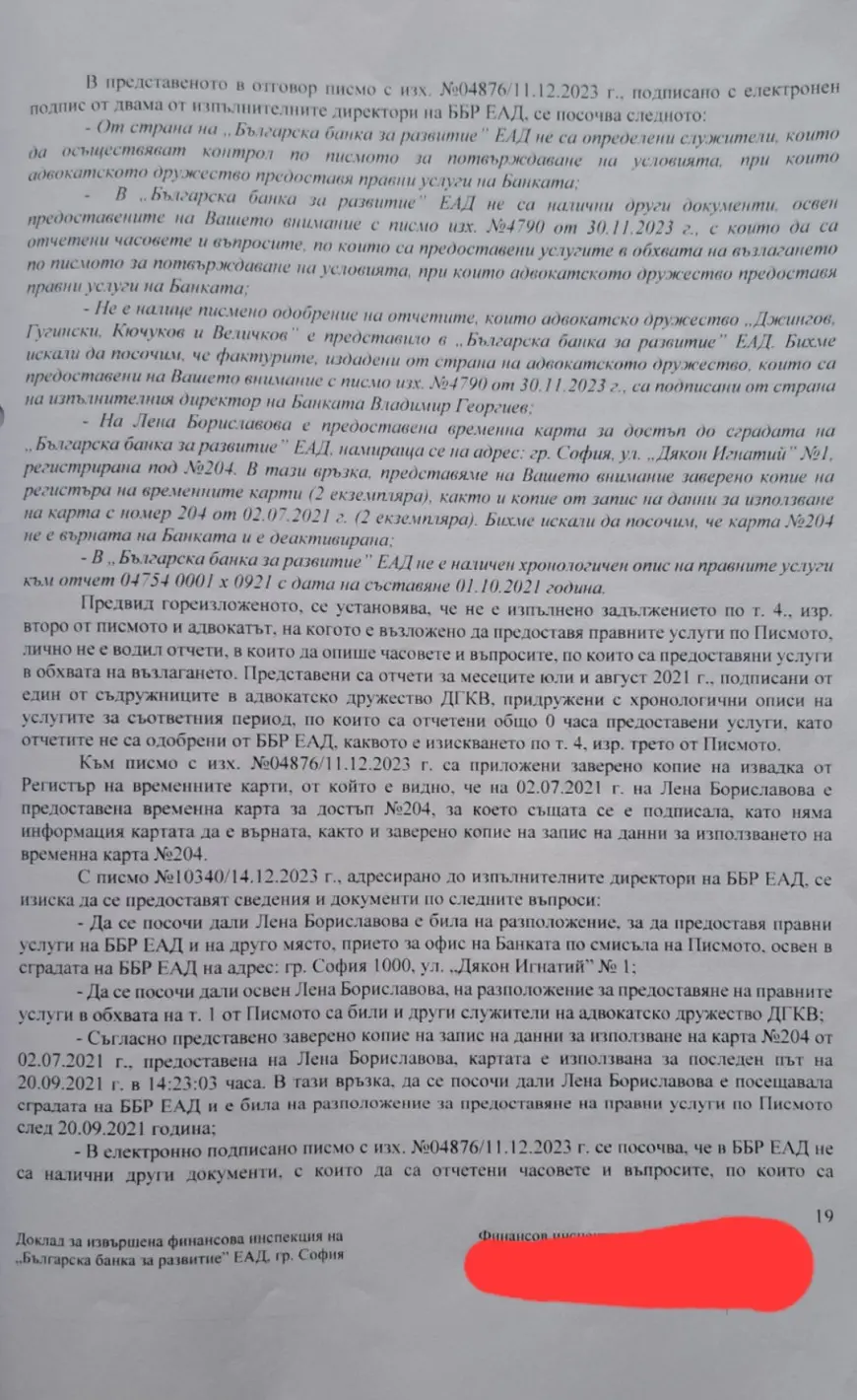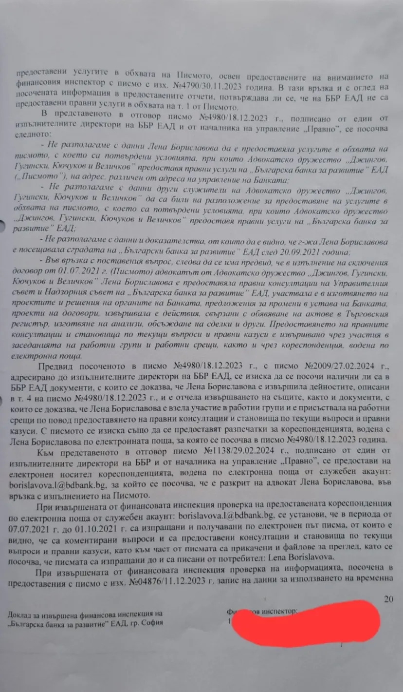 И още: Не разполагаме с данни Лена Бориславова да е предоставяла услугите в обхвата на писмото, с което са потвърдени условията, при които Адвокатско дружество „Джингов, Гугински, Кючуков и Величков“ предоставя правни услуги на Българска банка за развитие ЕАД (Писмото) на адрес различен от адреса на управление на банката.