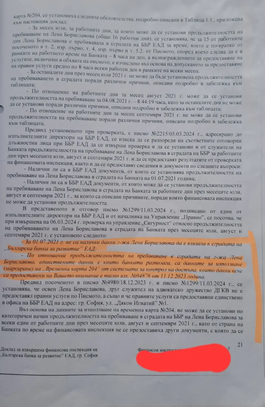 На разполагаме с данни и доказателства, от които да е видно, че г-жа Лена Бориславова е посещавала сградата на Българска банка за развитие ЕАД след 20.092021 година.