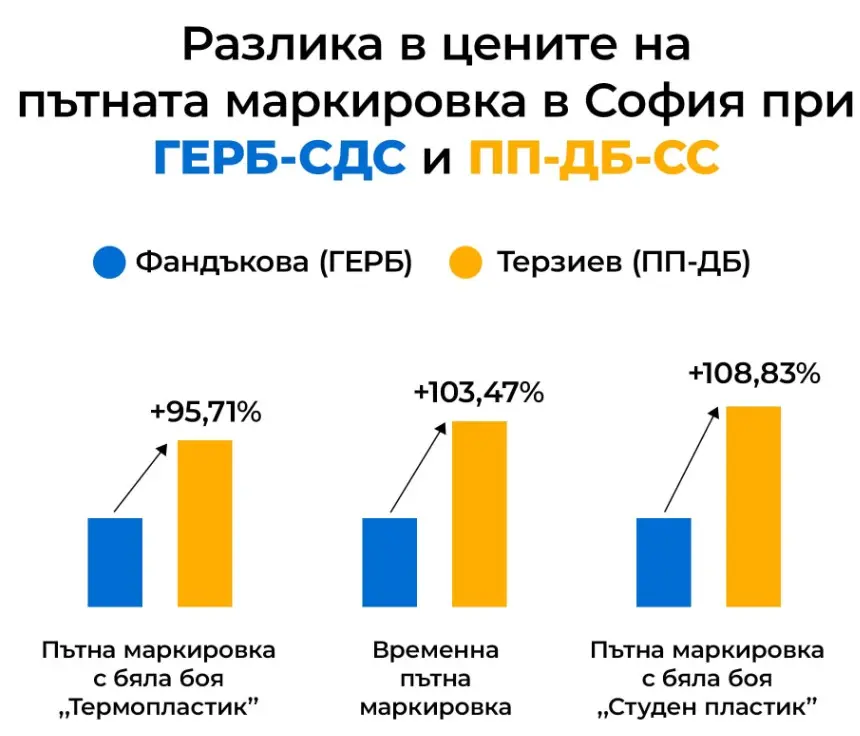 Георгиев подчертава, че със 103% се е увеличила и цената на временната пътна маркировка с бяла маркировъчна лента. За нея софиянци вече плащат 158,71 лв. на кв. м. спрямо цената до преди няколко месеца от 78 лв. на кв. м.