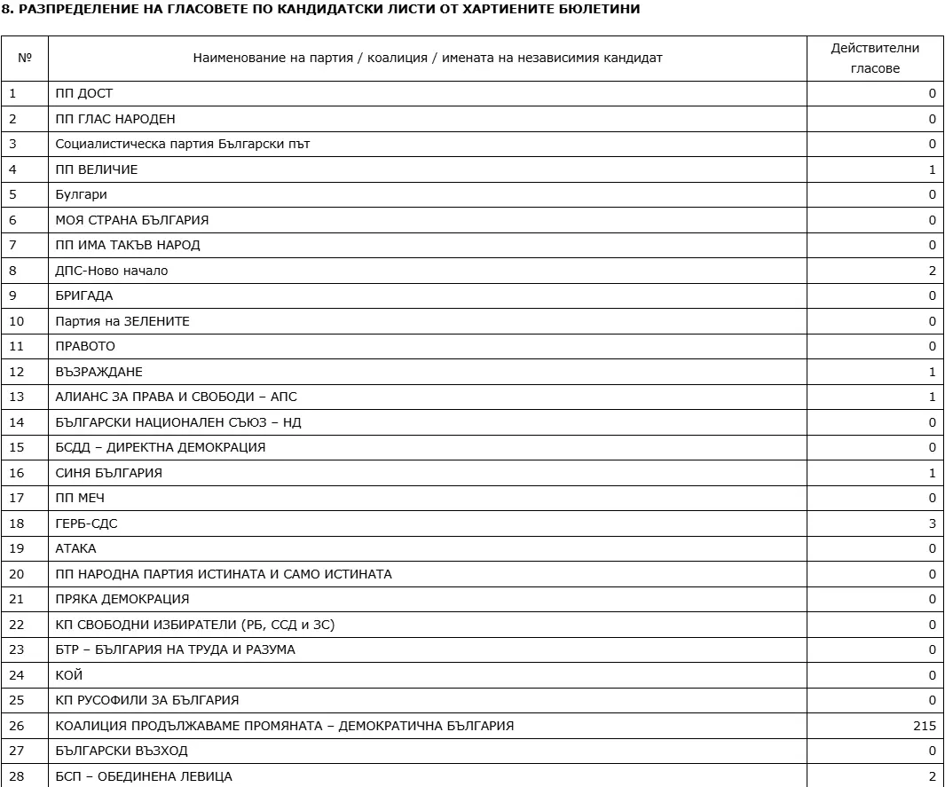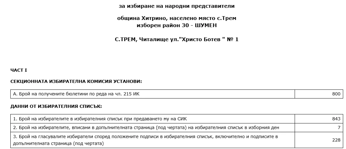 Най-много гласове имат ПП-ДБ в село Трем, община Хитрино, което се е превърнало в бастиот на „Промяната“. В шуменското село 215 от 226 души (94.3% от гласувалите) са предпочели коалицията. Нещо повече - от тези 215 гласа цели 212 са преференциите за кандидатът на ПП-ДБ под номер 4 в листата - Айлин Нуридин Пехливанова. Останалите 3 гласа в секцията са за ГЕРБ-СДС.