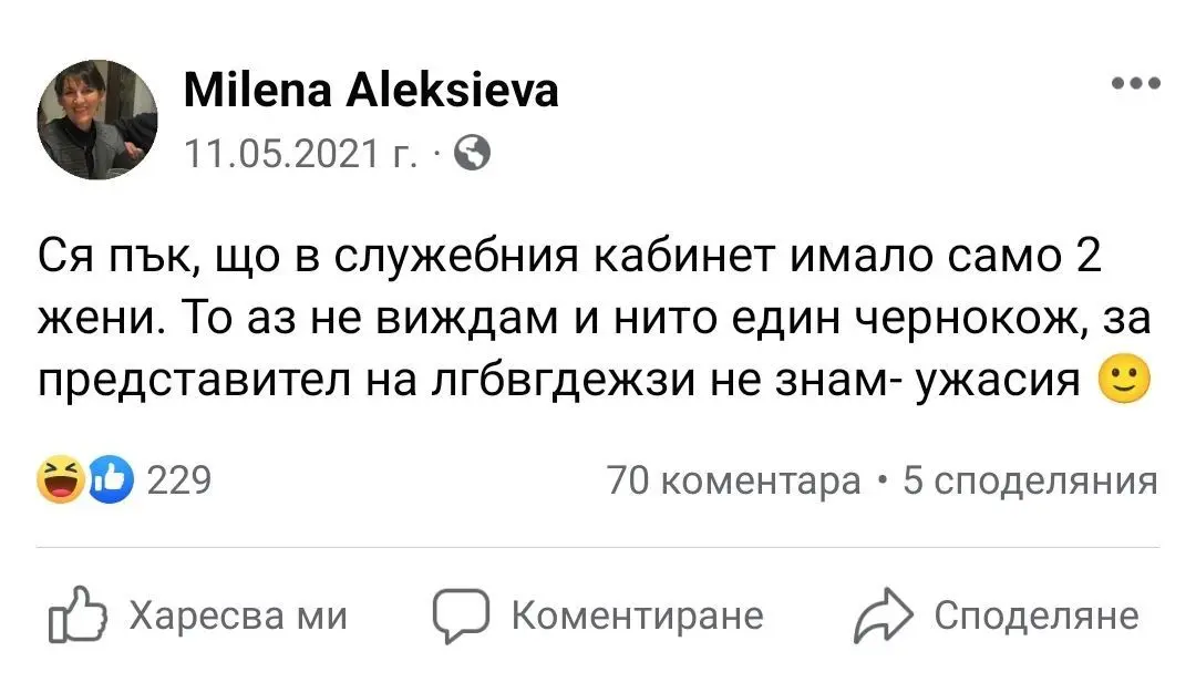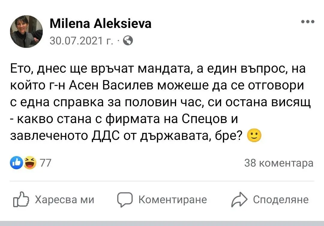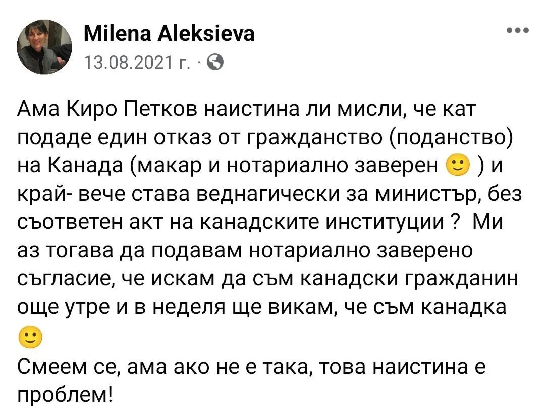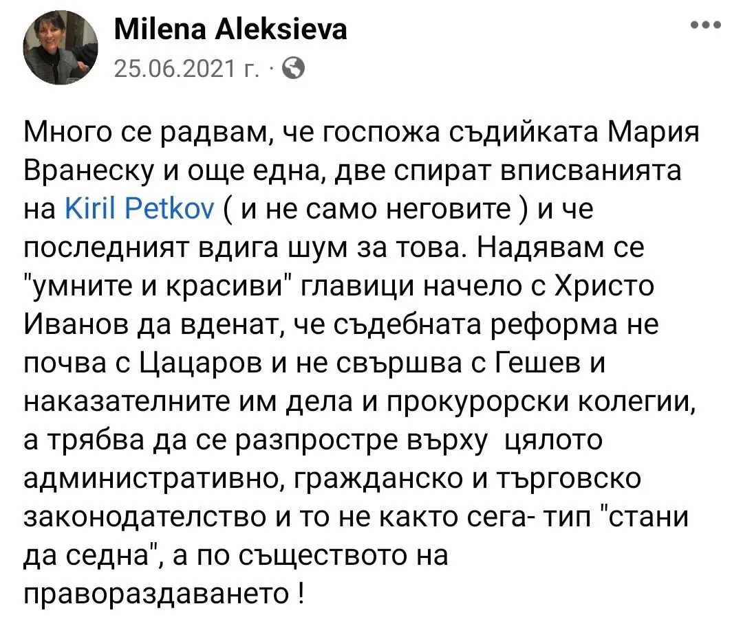 Кандидат-кметицата на „Спаси София“ за район „Панчарево“ Милена Алексиева е един от най-големите критици на „Промятата“ и Кирил Петков. От постовете й във Фейсбук става ясно, че никак не харесва ПП и дори е доволна, че преди време не успяха да се регистрират от първия път.