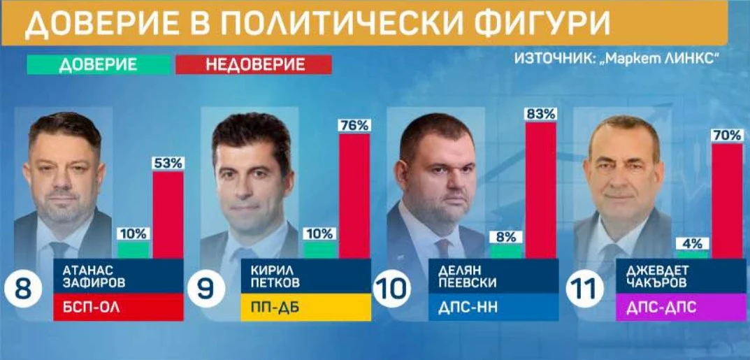 Графиката от изследването на „Маркет линкс“, обявено тази сутрин по БТВ, показва равенство в общественото доверие към трима от политическите лидери-Кирил Петков, Атанас Зафиров и Делян Пеевски. Разликата в одобрението между съпредседателя на ПП и доскорошен министър председател Кирил Петков и лидера на ДПС “Ново начало” Делян Пеевски е едва два процента. Процентът на рекордно неодобрение към Петков също прави впечатление.