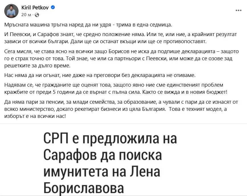 Съпредседателят на ПП Кирил Петков излезе с остра реакция във Фейсбук по повод предложението от СРП към главния прокурор да поиска имунитета на Лена Бориславова.