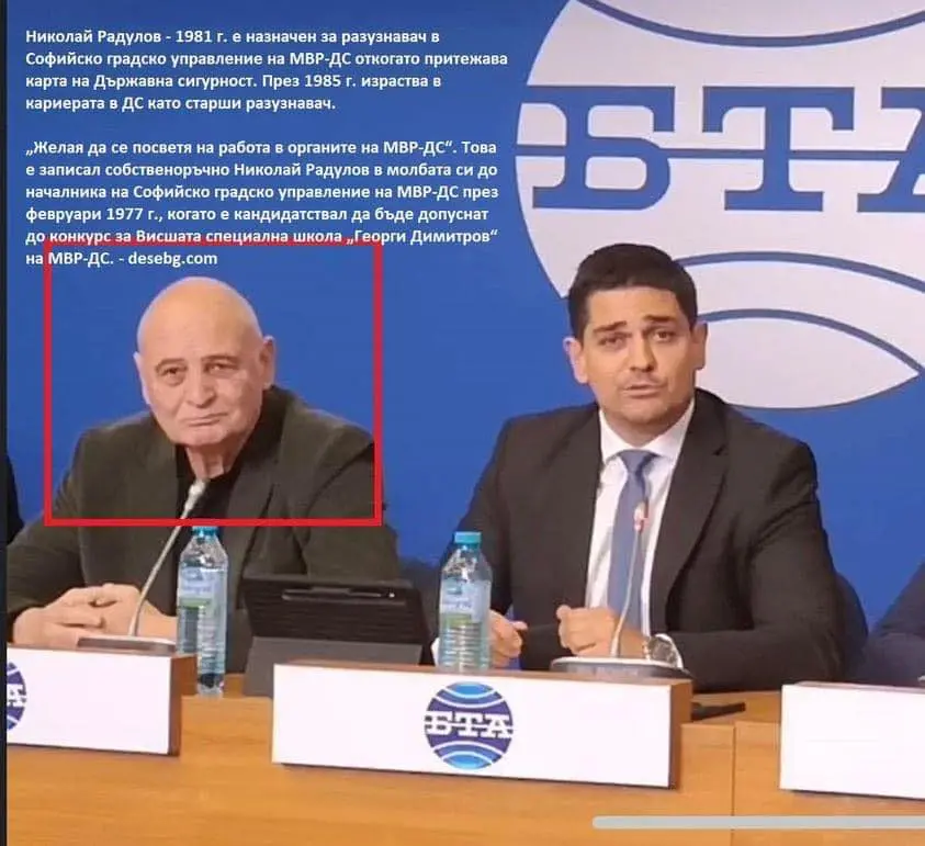 Към своя коментар Бориславова е пуснала и снимка от днешната пресконференция на която са Радостин Василев и Николай Радулов. Към образа на Радулов е написана и биографията като агент на Държавна сигурност.