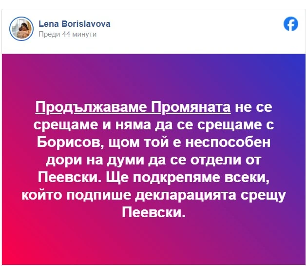 „Продължаваме Промяната не се срещаме и няма да се срещаме с Борисов, щом той е неспособен дори на думи да се отдели от Пеевски. Ще подкрепяме всеки, който подпише декларацията срещу Пеевски“, написа тя.