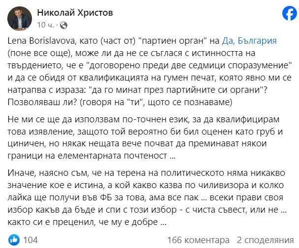 „Наясно съм, че на терена на политическото няма никакво значение кое е истина, а кой какво казва по чиливизора и колко лайка ще получи във ФБ за това, ама все пак ... всеки прави своя избор какъв да бъде и спи с този избор - с чиста съвест, или не ... както си е преценил, че му е добре ..." Това написа депутатът от "Демократична България" Николай Христов в своя фейсбук профил.