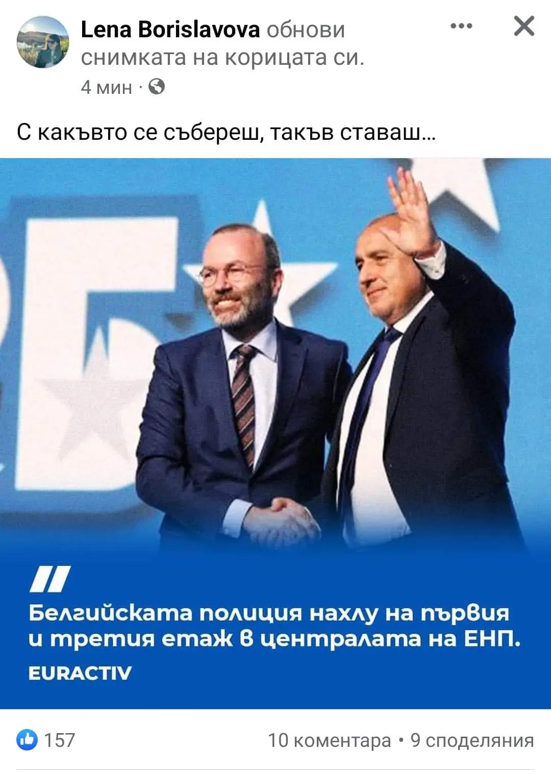 Преди минути бившата шефка на кабинета на Кирил Петков пусна пост, който гласи „С какъвто се събереш, такъв ставаш“. Повод за коментара й е новината, че белгийската полиция обискира офиси на ЕНП. Бориславова е пуснала и снимка на лидера на ГЕРБ Бойко Борисов с председателят на ЕНП Манфред Вебер.