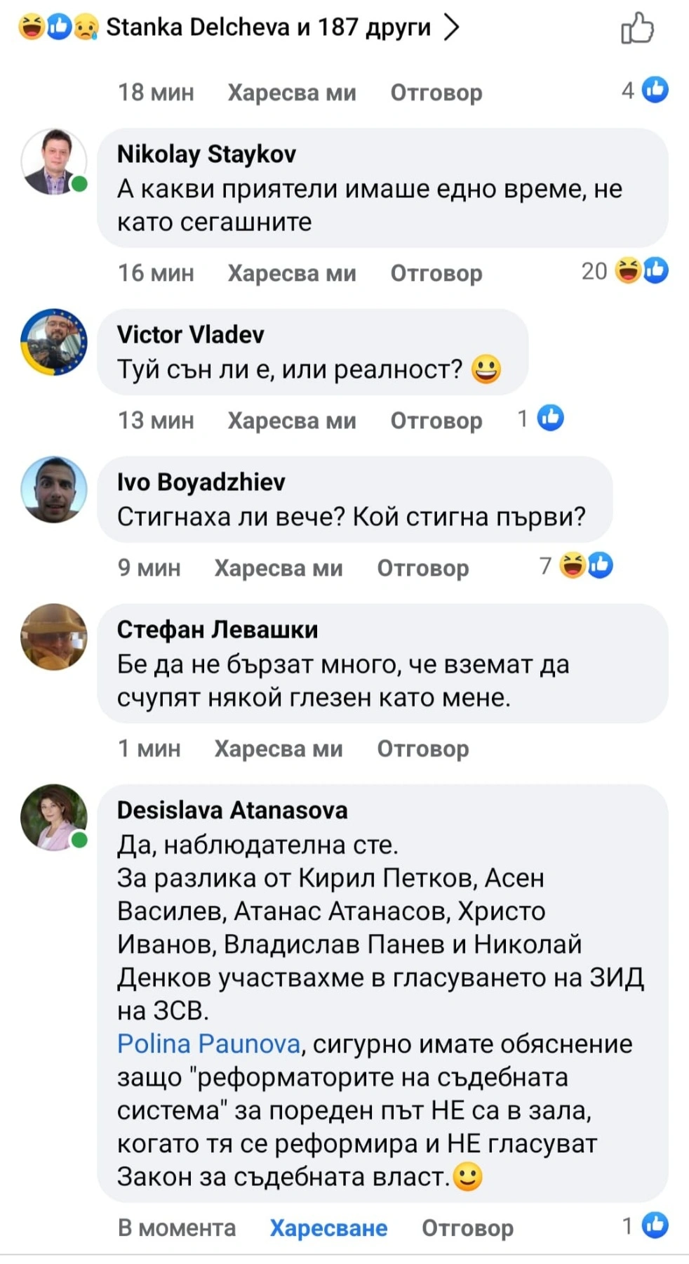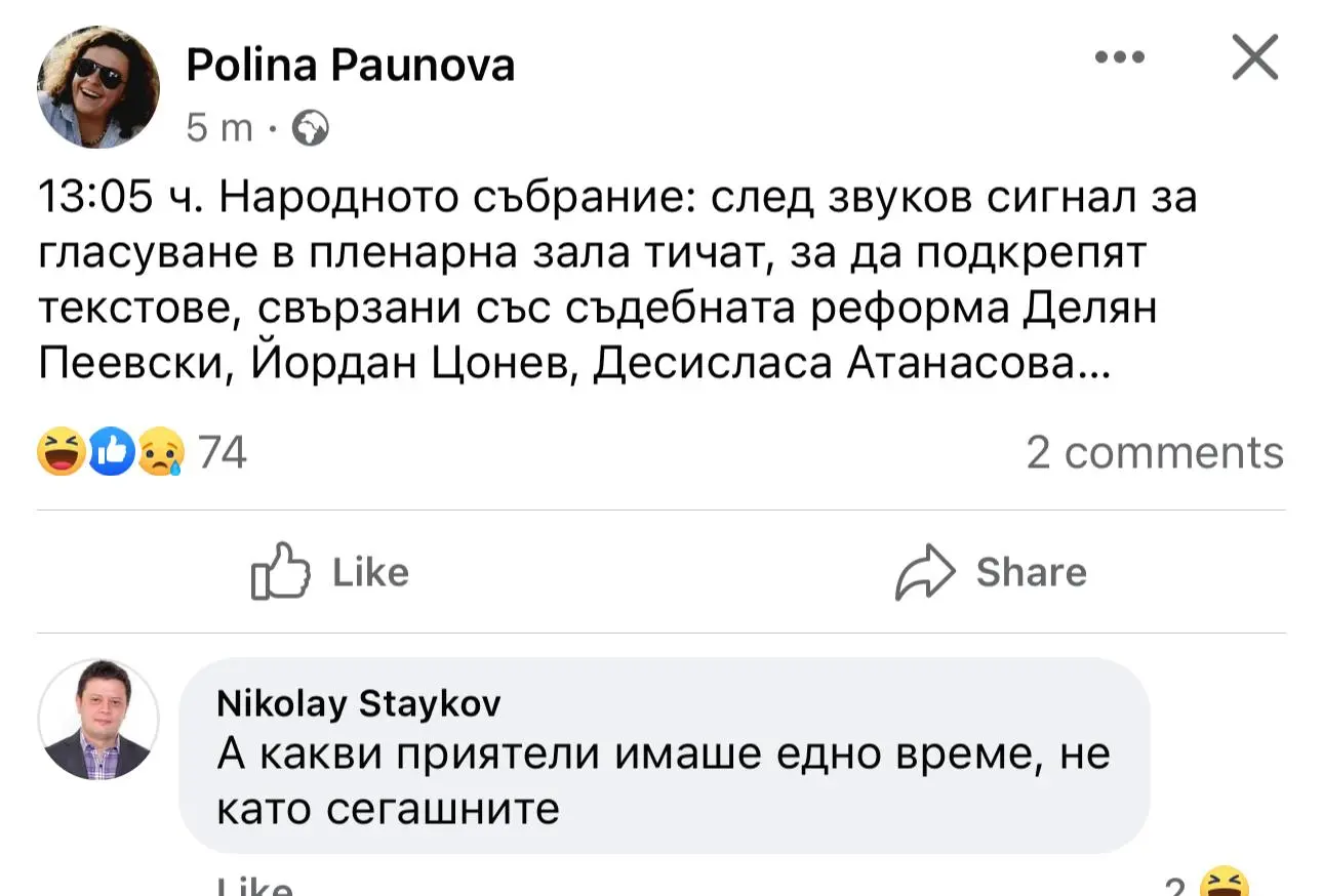 Повод за нейните думи е коментар на журналистката Полина Паунова, която се присмива, че депутати от ДПС и Атанасова са тичали към зала, за да гласуват разследването и контрола на главния прокурор.