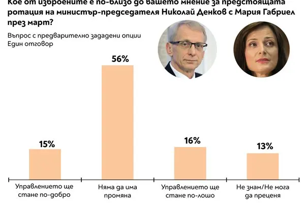 Няма сериозно очакване за промяна, породена от предстоящата ротация на министър-председателя Николай Денков с Мария Габриел. Според 56% ротацията няма да промени съществено управлението.