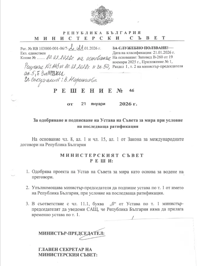 Министерският съвет публикува решението си за присъединяване на България към Съвета за мир, иницииран от президента на Съединените американски щати Доналд Тръмп.