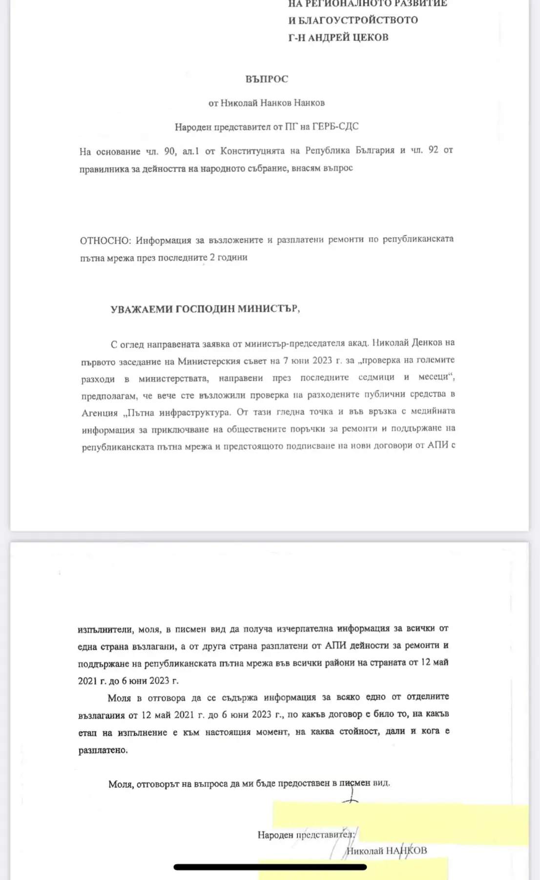 Това съобщи в профила си във Фейсбук депутатът от ГЕРБ и бивш регионален министър Николай Нанков, който публикува официалната кореспонденция (виж най-долу).