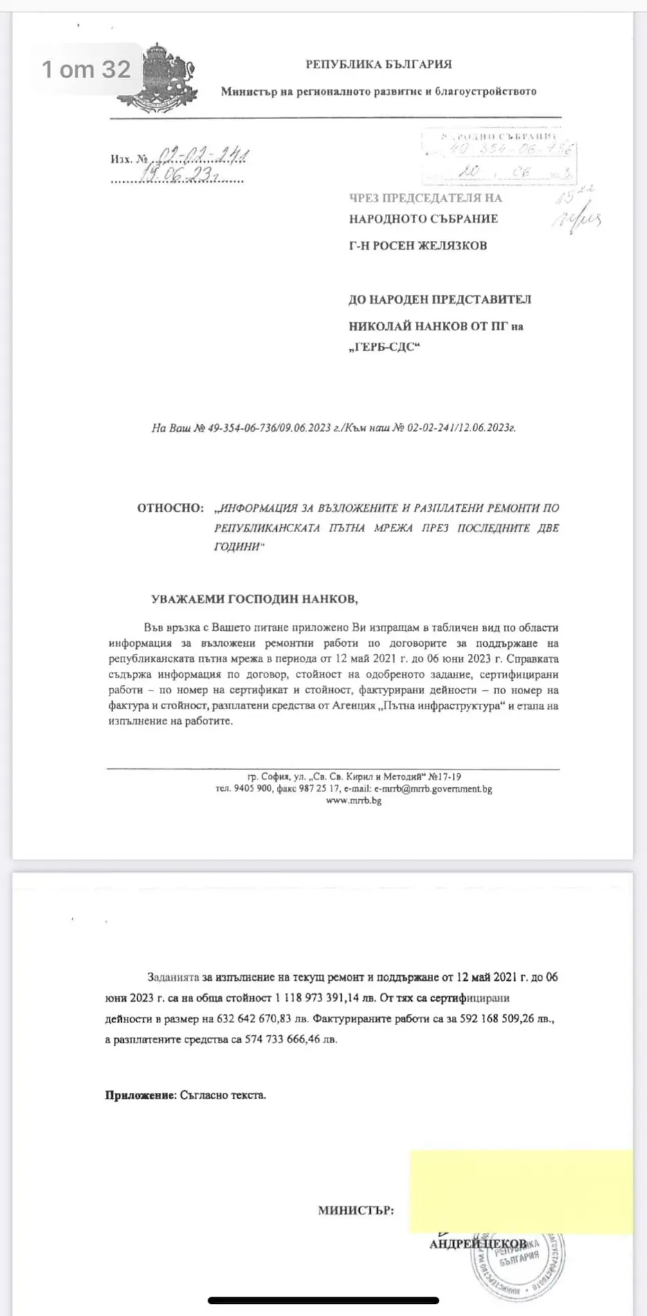 „Знаете ли каква е стойността на лъжата срещу ГЕРБ за ремонта и поддържането на пътищата? Над милиард. И по-конкретно 1 118 973 391,14 лв. Точно толкова струват на държавата заданията на АПИ за изпълнение на текущ ремонт и поддържане от 12 май 2021 г., откогато ГЕРБ не управлява, до 6 юни 2023 г., когато беше избрано настоящото редовно правителство. От този над 1 милиард са сертифицирани дейности за 632 642 670,83 лв. Фактурираните работи са за 592 168 509,26 лв. Разплатени са 574 733 666,46 лв. Всички тези числа с подробна таблица по области са в писмен отговор на мой въпрос към регионалния министър Андрей Цеков /пълният текст с приложенията е на страницата на НС/“.