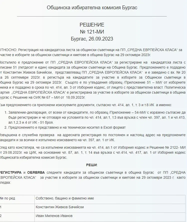 Спряганият за кандидат на Промяната Константин Бачийски се регистрира като кандидат-кмет, но от партията, чийто лидер е - Средна европейска класа. ачийски подаде и документи за листата за общински съветници на СЕК - партията, станала мандатоносител на Продължаваме промяната.