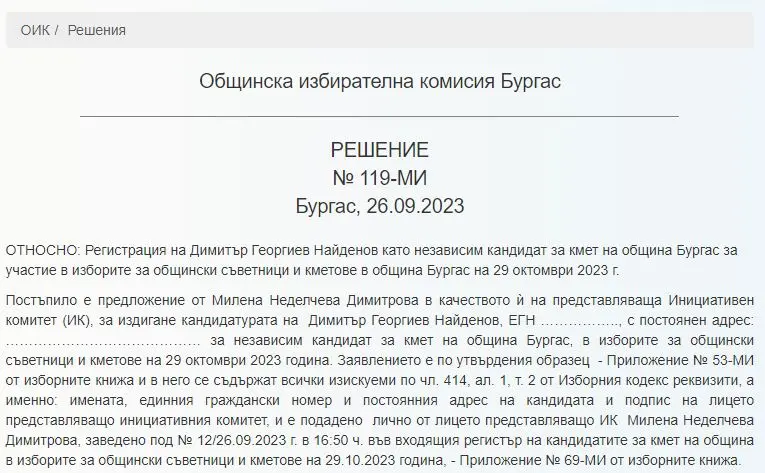 Човекът на Демократична България Димитър Найденов пък бе регистриран като независим кандидат за кметската надпревара.