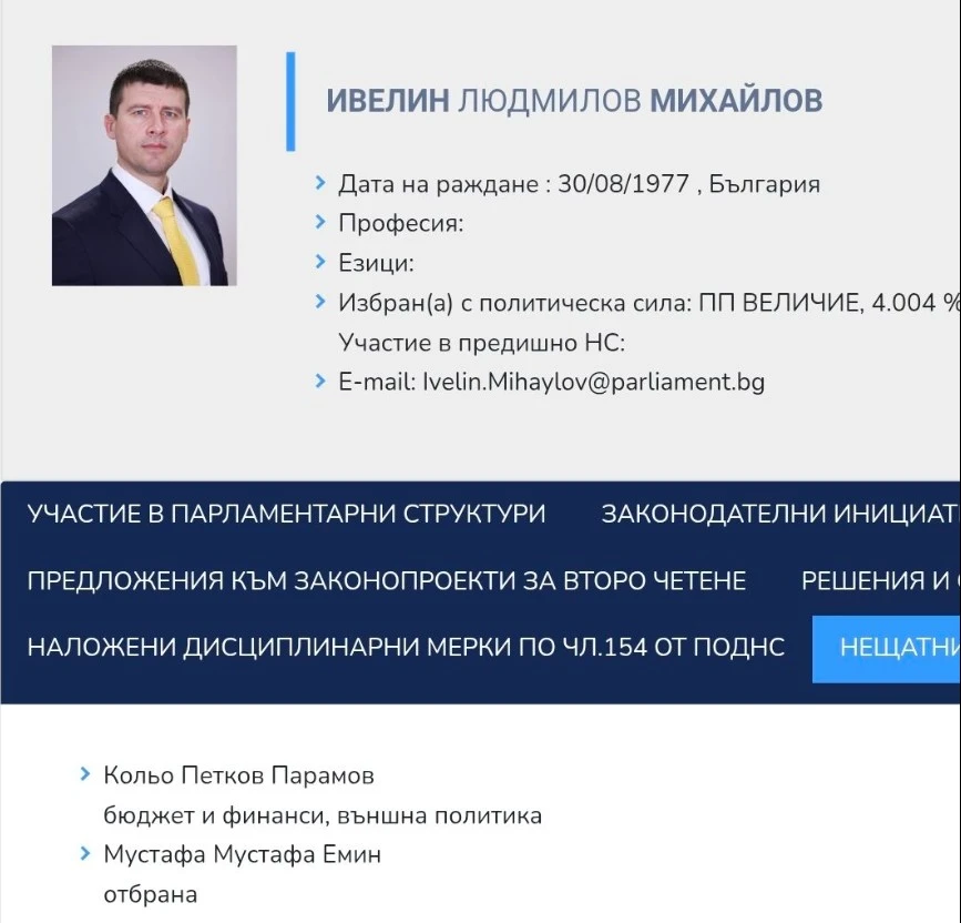 Мустафа Емин, доскоро свързван с ръководството на „Да, България“ и част от коалицията „Демократична България“, е назначен за нещатен сътрудник на депутата от националистическата партия „Величие“ – Ивелин Михайлов. Информацията е публикувана в официалния регистър на Народното събрание.