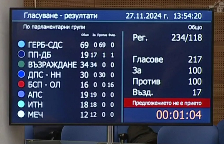 На балотаж за Рая Назарян гласуваха "за" 69 депутати, "против" 147, "въздържал се" се 4. За Силви Кирилов гласува "за" 100 депутати, "против" 100 и 17 "въздържал се".