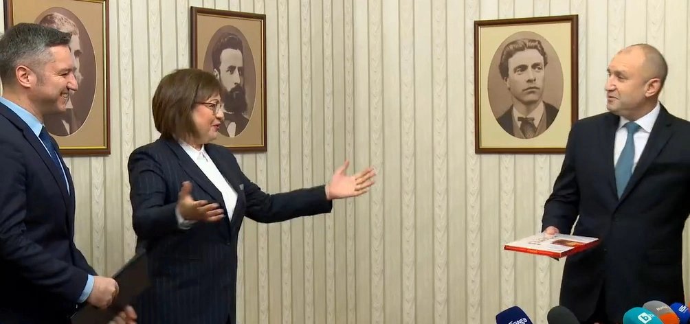 Президентът Румен Радев връчи и последния мандат за сформиране на кабинет в рамките на този парламент. Той вече е в ръцете на БСП, които имат по Конституция седмица, за да се опитат да съставят правителство. Радев подари и голям букет червени рози на рожденичката Корнелия Нинова.