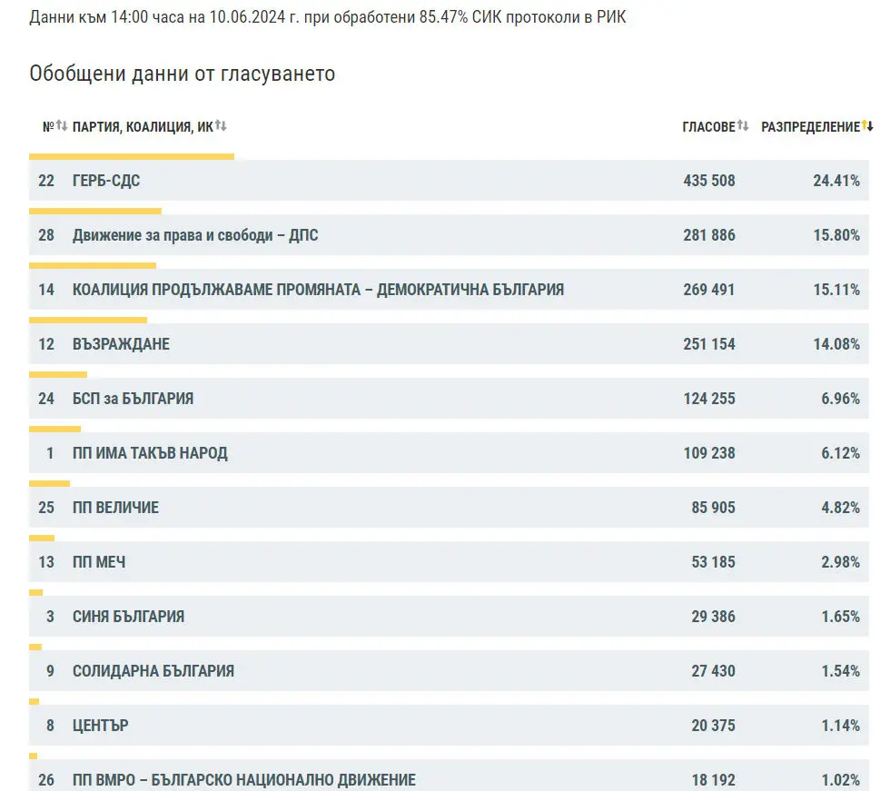 Централна избирателна комисия обяви 85.47% обработени СИК протоколи в РИК към 14.00 часа в деня след вота за Народно събрание.