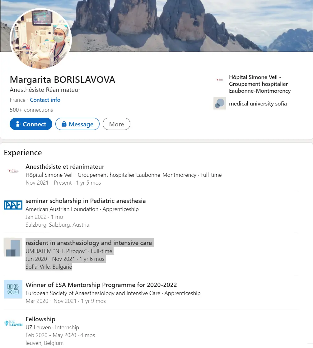 Според профила ѝ в Linkedin д-р Маргарита Бориславова работи в „Пирогов“ в продължение на 1 година и 6 месеца – между юни 2020 и ноември 2021. На практика тя напуска България по време на втория кабинет на Стефан Янев, в който Кирил Петков и Асен Василев не участваха, за да започнат своя политически проект. В момента тя работи в анестезиологията на болница „Симон Вейл“ в Обон, в северните предградия на Париж.