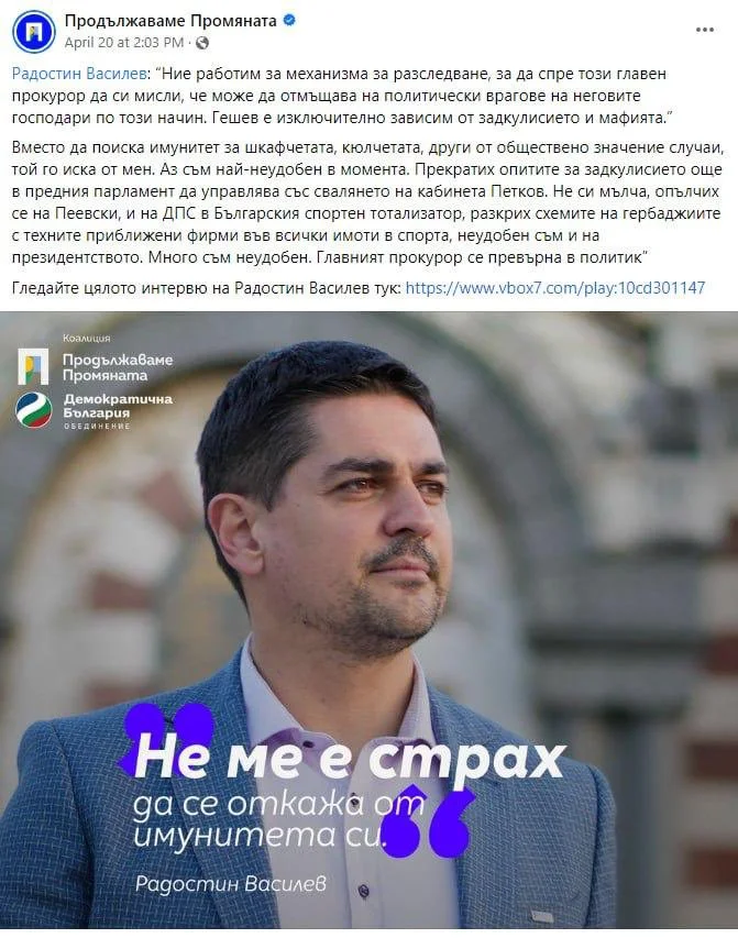 През април прокуратурата поиска НС да свали имунитета на Василев, след което той написа в социалните мрежи: "Главният прокурор Иван Гешев поиска от Народно Събрание моя имунитет заради това, че преди година разговарях емоционално с мой колега депутат по телефона“. Тогава Василев пусна във фейсбук и плакат “Не ме е страх да се откажа от имунитета си”.
