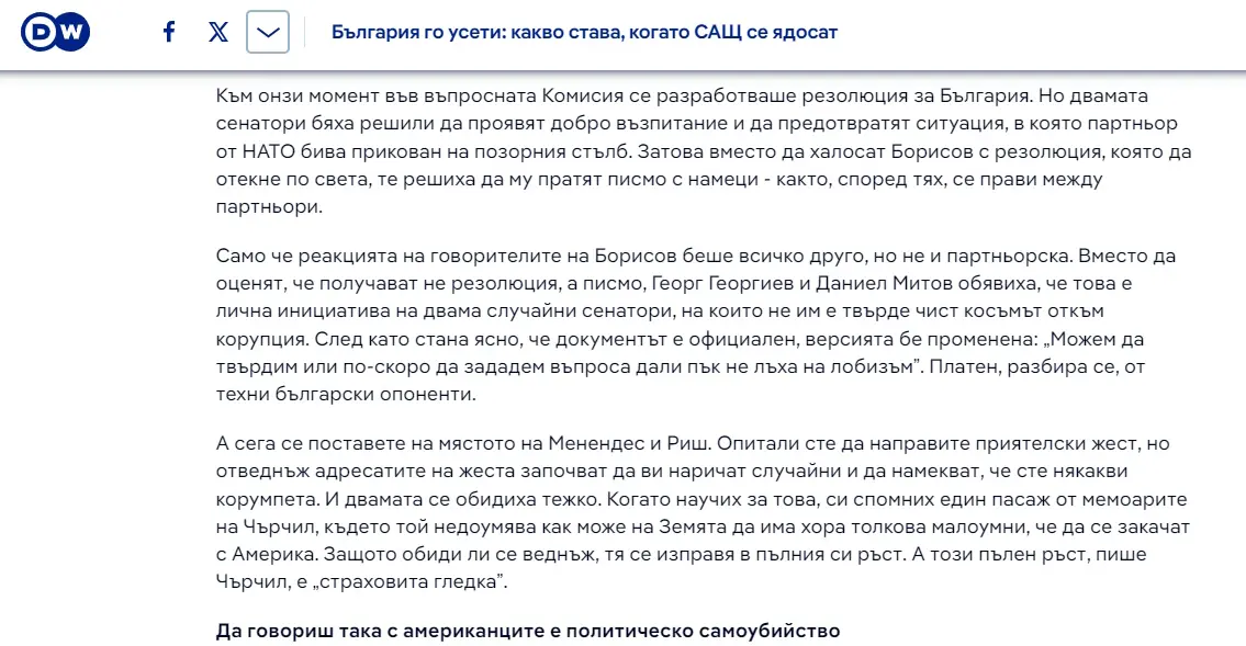 Сриващото писмо на Менендес бързо го изстреля като основен любимец на протестиращите, а проф. Евгений Дайнов дори възхвали Менендес в DW за това колко дипломатично писмо е написал, а „авторитарния режим на Борисов не е разбрал“. „Към онзи момент във въпросната Комисия се разработваше резолюция за България. Но двамата сенатори бяха решили да проявят добро възпитание и да предотвратят ситуация, в която партньор от НАТО бива прикован на позорния стълб“, „разкри“ Дайнов, който обяви реакцията на ГЕРБ и Борисов като „политическо самоубийство“.