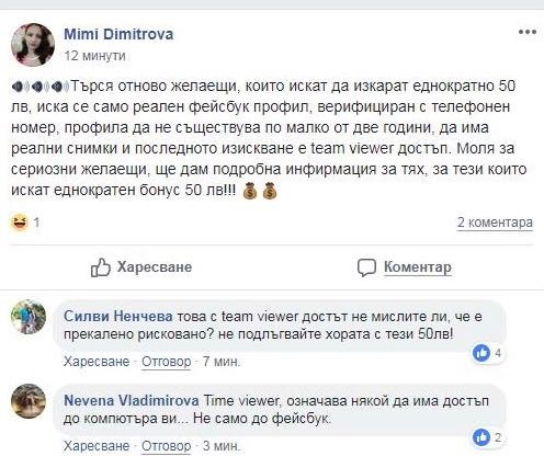 Потребител с името Mimi Dimitrova (не е сигурно дали профилът е истински или не) чрез статус търси хора, които срещу 50 лева трябва да дадат достъп до профила си и до информацията в личните си компютри. От написаното става ясно, че не за първи път се организира подобна акция.
