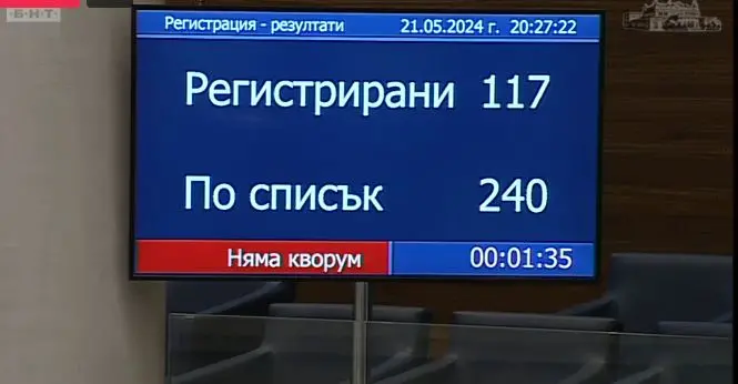 При втората регистрация в залата се записаха 117 народни представители. При третия опит в 20:45 ч в залата се появи само още 1 депутат, който вдигна кворума до 118, но така и не стигна до 121 необходими за старт на нощно заседание.