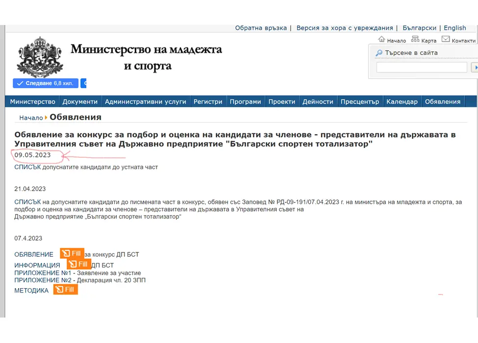 От интернет страницата на министерство данните за конкурса става ясно, че са качени на датата 09.05.2023. Към този момент обаче конкурсът вече на практика е бил приключил. По-ранни съобщения на интернет страницата липсват, въпреки че конкурсът стартира със заповед № РД-09-191 на министъра от 07.04.2023.