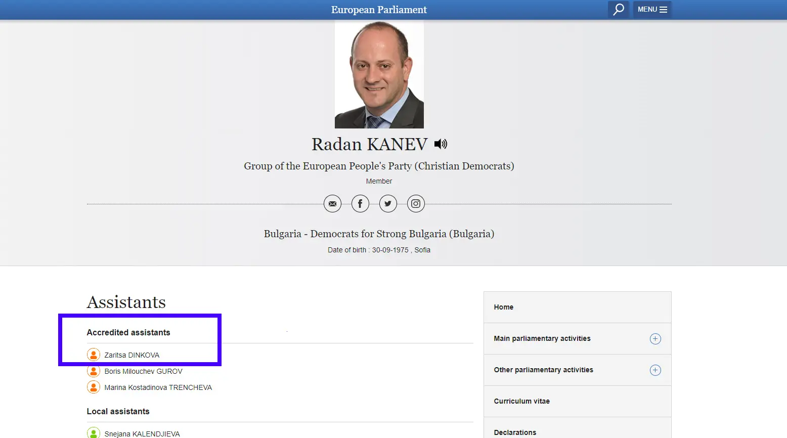 След три месеца като министър, името Динкова все така стои сред асистентите на Радан Кънев в ЕП
