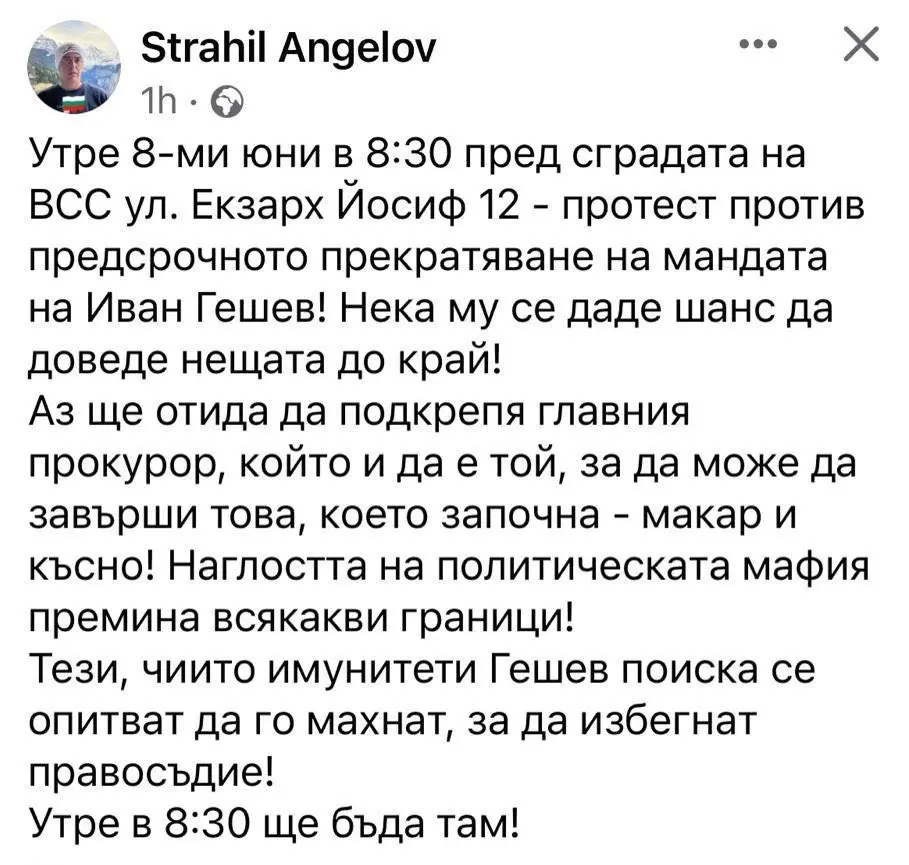 Утре, на 8 юни в 8:30 пред сградата на ВСС ул. Екзарх Йосиф 12 ще се проведе протест против предсрочното прекратяване на мандата на Иван Гешев. Това обяви в профила си във Фейсбук социалистът Страхил Ангелов.