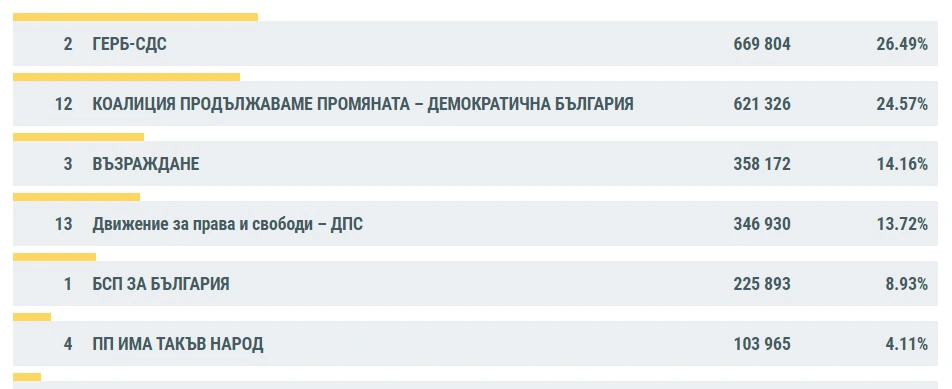 ЦИК ще обявят и мандатите, които ще получи всяка формация в парламента. Предварителните изчисления показват следното разпределение на парламентарните групи: