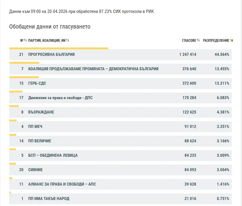 ЦИК при 91,68 % обработени протоколи: "Прогресивна България" печелят категорично, ПП-ДБ остават трети
