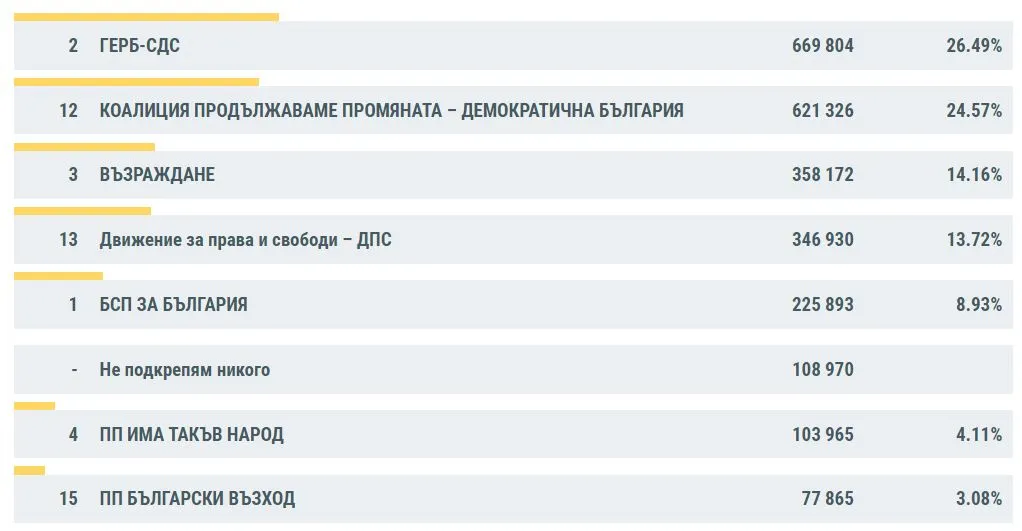 ГЕРБ-СДС води с 26.49% пред коалицията "Продължаваме промяната - "Демократична България", които са с 24.57%.