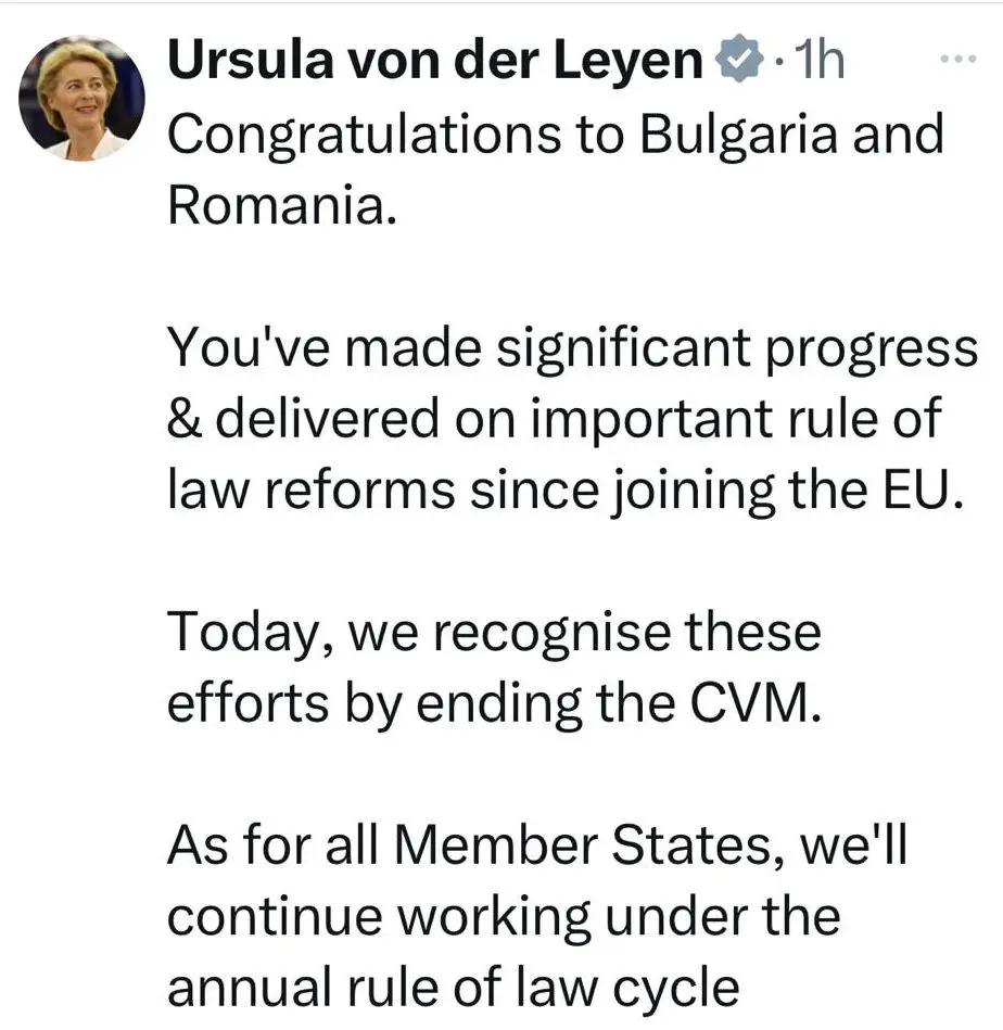 „Бих искалa да поздравя България и Румъния за значителния напредък, постигнат от присъединяването им към ЕС досега". Това написа председателката на ЕК Урсула фон дер Лайен по повод отпадането на мониторинга за България и Румъния.