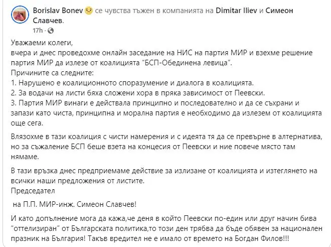 „Проведохме онлайн заседание на НИС на партия МИР и взехме решение партия МИР да излезе от коалицията “БСП-Обединена левица”.