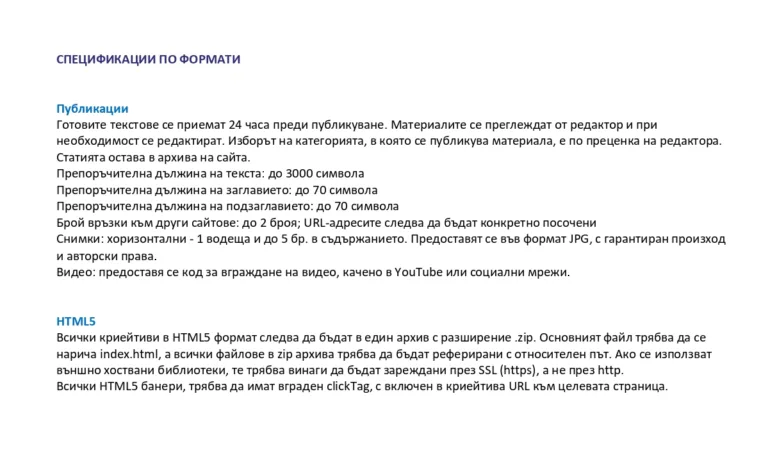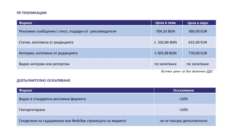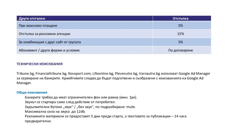 За реклама в Tribune.bg, Financialtribune.bg, Novsport.com, Lifeonline.bg, Plevenutre.bg, Varnautre.bg