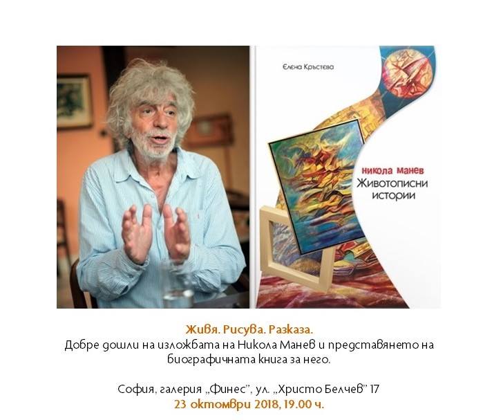„Ще бъде представена и биографичната книга за Никола Манев “Животописни истории” с автор Елена Кръстева. Заповядайте да съпреживеем заедно емоцията от незабравимите, слънчеви масла, пастели и акварели на големия художник Никола Манев“, призовават от галерия „Финес”.