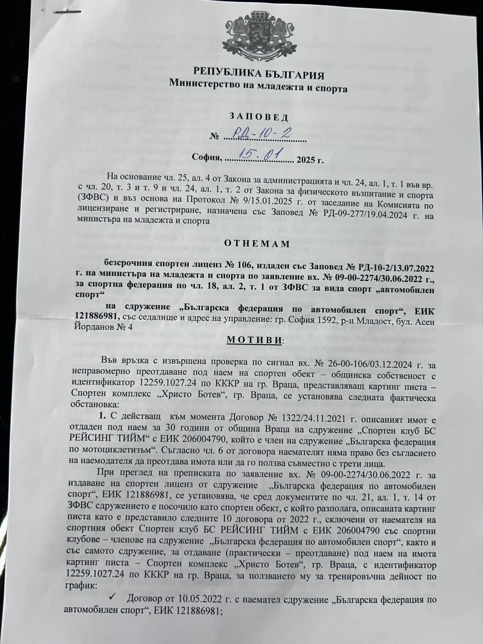Новината с арогантен пост във фейсбук съобщи председателят на БФАС Румен Дунев. Той дори публикува първата страница от заповедта за отнемане на лиценз, с която обаче без да иска разкрива поне част от причините това да се случи - неправомерно използване или поне деклариране за използване на писта за картинг във Враца. Защо не е публикувал цялата заповед е загадка.