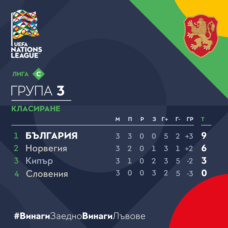 Българският национален отбор по футбол излиза срещу Норвегия в двубой за първото място в групата в турнира Лигата на нациите. След 3 победи българите са безапелационни водачи с пълен актив от 9 точки. Норвегия е втора с 6.