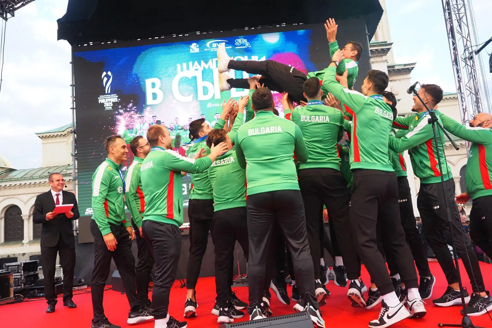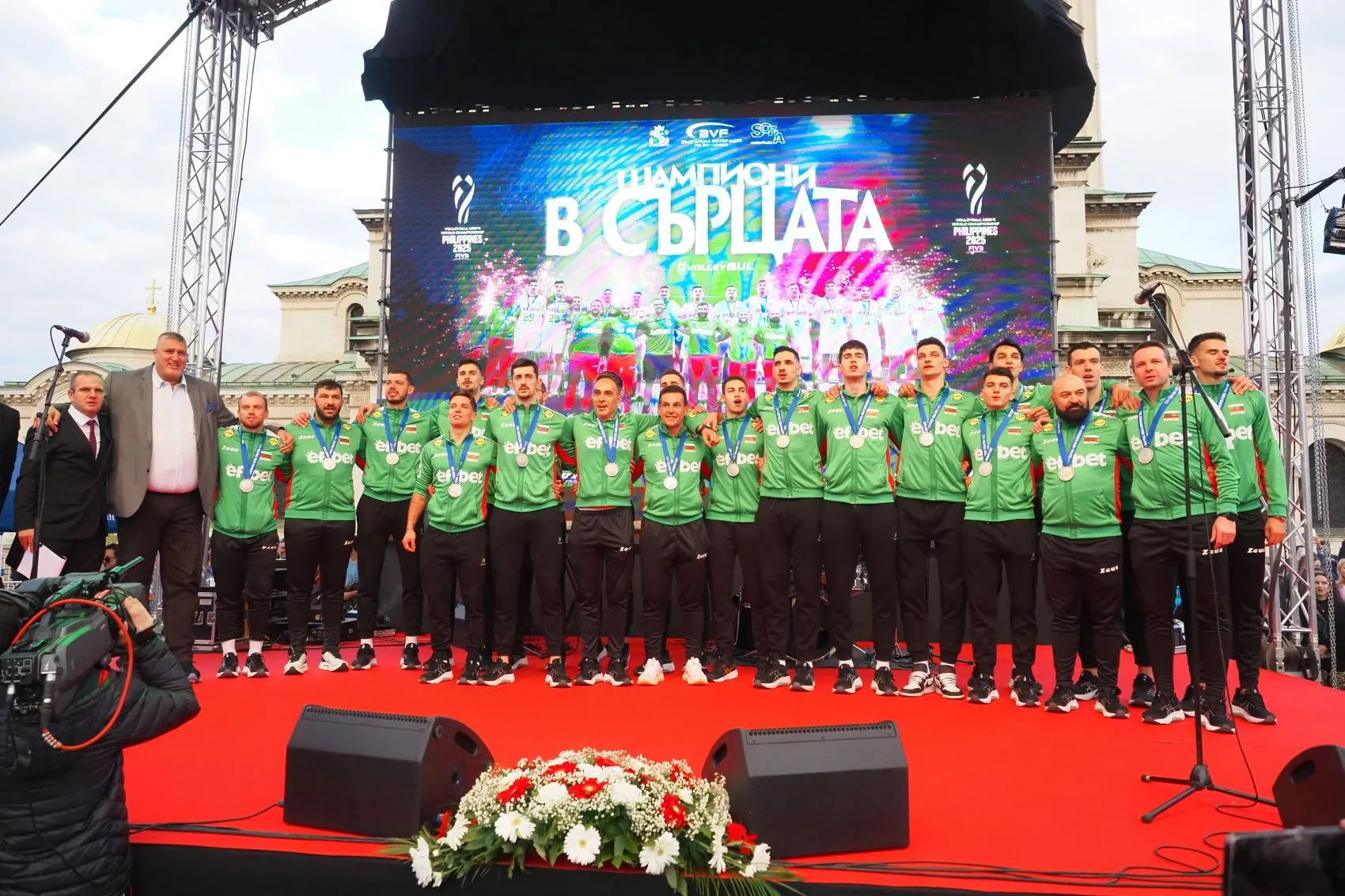 Тази сутрин, малко след 10:00 ч. те кацнаха на летище "Васил Левски" в София и бяха посрещнати официално като истински герои от гвардейска част, вицепремиера Атанас Зафиров, както и от техните близки и семейства. Българската федерация по волейбол и Столична община организираха тържествено посрещане на отбора, което се провежда на площад „Св. Александър Невски“. Входът е свободен за всички. Шампионското посрещане на площада Още от 14:00 ч. бе ограничено движението в целия район около "Св. Александър Невски" от към ул. "Оборище", всички дъги бяха изчистени и е забранено паркирането по тях, градският транспорт в района няма да се спира. Все пак по преценка на Пътна полиция могат да се затворят и още пътища, тъй като на площада се очакват много хора, каза Красимир Димитров, директор на "Аварийна помощ и превенция" към Столична община. Няма КПП-та, но от рано има засилено полицейско присъствие и филтровъчни пунктове. Полицията следи за видимо пияни хора и такива в неадекватно състояние, те няма да бъдат допуснати. Забранено е на площада да се внася пиротехника, стъклени шишета, знамена с твърди дръжки, хладно и огнестрелно оръжие. Забранява се и вдигането на дронове в района на и около площада, освен ако не е получено специално разрешение за това. От около 16:00 ч. на екраните на площада пред катедралата се излъчват кадри от мачовете на националния отбор на България на Мондиала, съчетани с музикална програма. Сред изпълнителите са Ана Ставрева, Елена Попова, Никола Янакиев, Натали Стефанова, Бон-Бон, Братя Аргирови и Фондацията със Славин Славчев.